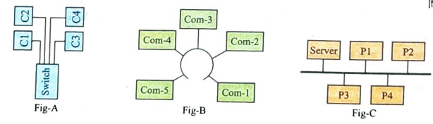 গ) Fig-C নির্দেশিত নেটওয়ার্ক টপোলজিটি হলো বাস টপোলজি। যে টপোলজিতে একটি সংযোগ লাইনের সাথে সব ধরনের নোড অর্থাৎ কম্পিউটার ও অন্যান্য যন্ত্রপাতি বা ডিভাইস ইত্যাদি যুক্ত থাকে তাই বাস টপোলজি। এতে প্রধান সংযোগ লাইনের দু’প্রান্তে দু’টি টার্মিনেটর থাকে। এই প্রধান সংযোগ লাইনকে বাস (Bus) বলা হয়।