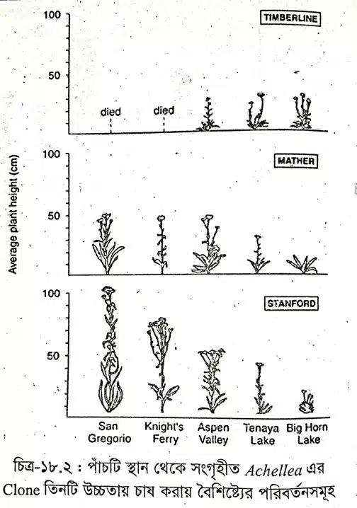 তাঁরা ৫টি স্থানে (San Gregorio, Knight’s Ferry, Aspen Valley, Tanaya Lake এবং Big Harn Lake)একই জেনোটাইপযুক্ত Achellea এর Clone তিনটি উচ্চতায় (Stanford, Mather এবং Timberlin) এ চাষ করেন। তাঁরা লক্ষ করেন যে, বিভিন্ন উচ্চতায় এদের বৈশিষ্ট্যের অনেক পরিবর্তন দেখা যায়।