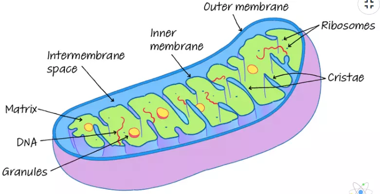 গ) উদ্দীপকে উল্লিখিত প্রথম অঙ্গাণুটি হলাে মাইটোকন্ড্রিয়া । নিচে মাইটোকন্ড্রিয়ার গঠন চিত্রসহ বর্ণনা করা হলো-