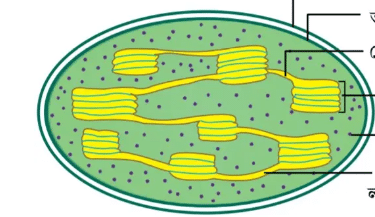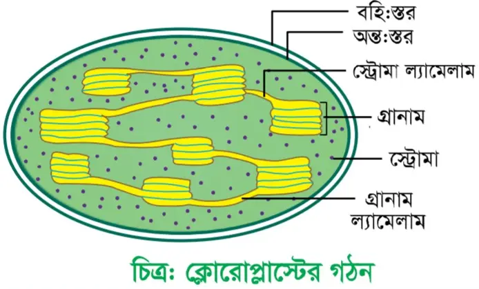 গ) উদ্দীপকে বর্ণিত ‘J’ কোষ অঙ্গাণুটি হলাে ক্লোরােপ্লাস্ট। নিচে ক্লোরােপ্লাস্টের গঠন চিহ্নিত চিত্রসহ বর্ণনা করা হলাে-