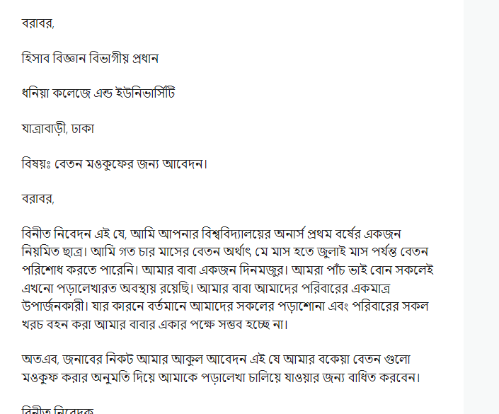 বিনীত নিবেদন এই যে, আমি আপনার কলেজের একজন রেগুলার ছাত্র। আমি আপনার কলেজের মানবিক বিভাগের একাদশ শ্রেণির একজন রেগুলার ছাত্র। গত অর্ধ-বার্ষিকী এক্সামে আমি ৮০ ভাগ নম্বর পেয়েছি। প্রার্থনা করি, আগামি বার্ষিক পরীক্ষাতে আমি আরও অনেক ভালো ফলাফল করে আপনার কলেজের সুনাম বৃদ্ধি করার জন্য যোগ্য হবো। আমার আব্বা একজন দিনমজুর বিধায় পরিবারের ব্যয় চালিয়ে আমার কলেজের বেতন পরিশোধ করার জন্য একেবারেই অক্ষম।