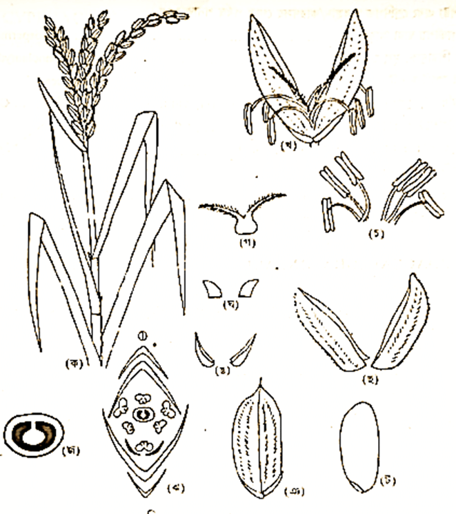 ক. উদ্ভিদ, খ. স্পাইকলেট, গ, স্ত্রীস্তবক, ঘ, লডিকিউল, ৬. লেমা প্যালিয়া, চ. পুংস্তবক