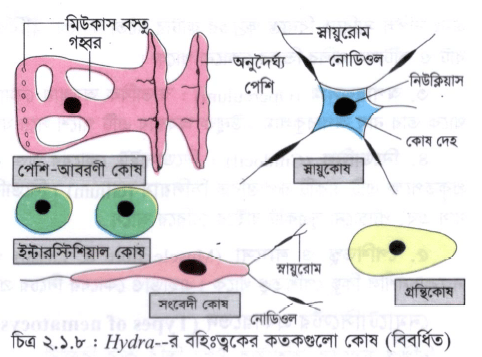 ৪. স্নায়ু কোষ (Nerve Cell) : এসব কোষ মেসোগ্লিয়া ঘেঁষে অবস্থিত, অনিয়ত আকারবিশিষ্ট এবং একটি ক্ষুদ্র কোষদেহ ও দুই বা ততোধিক নোডিওলযুক্ত সূক্ষ্ণ শাখান্বিত স্নায়ুরোম নিয়ে গঠিত। তন্তুগুলো পরস্পর মিলে স্নায়ু-জালিকা গঠন করে ।