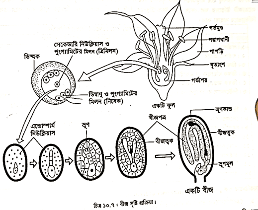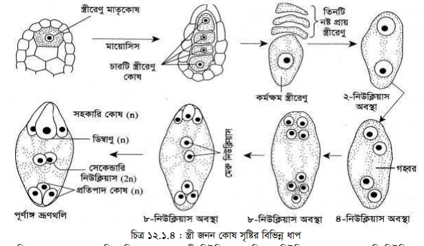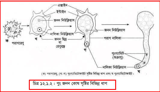 (iii) পরগনালিকার জণথলিতে প্রবেশ ও শুক্রাণু নিক্ষিপ্তকরণ : পরাগনালিকা প্রথমে গভাশয়ের স্তর ভেদ করে ডিম্বকে প্রবেশ করে। ইতোমধ্যে ডিম্বকে অবস্থিত স্ত্রীরেণু হতে ডিম্বাণু সৃষ্টি হয়।