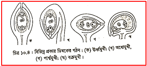 ১। উধ্বমুখী (Orthotropous বা Atropous) : ঊর্ধ্বমুখী অর্থাৎ ডিম্বকের মুখ উপরে থাকে। এই প্রকার ডিম্বকে ডিম্বকনাড়ী, ডিম্বকমূল ও ডিম্বকরন্ধ্র একই সরল রেখায় খাড়াভাবে অবস্থিত থাকে। ডিম্বকরন্ধ্র শীর্ষে এবং ডিম্বকমূল গোড়ায় অবস্থান করে। উদাহরণ: বিষকাটালী (পানি মরিচ), গোলমরিচ, পান ইত্যাদি।