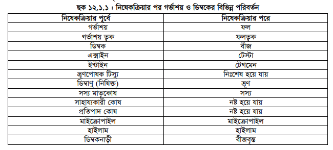নিষেকের পর ডিম্বকের অভ্যন্তরে এরূপ পরিবর্তনের সাথে সাথে ডিম্বকের ত্বক দুটি অপেক্ষাকৃত কঠিন ও শুষ্ক হয়ে ত্বকে পরিণত হয়। রসালো ডিম্বকটি পানি হারিয়ে অপেক্ষাকৃত কঠিন ও শুষ্ক হয়ে বীজে পরিণত হয়।
