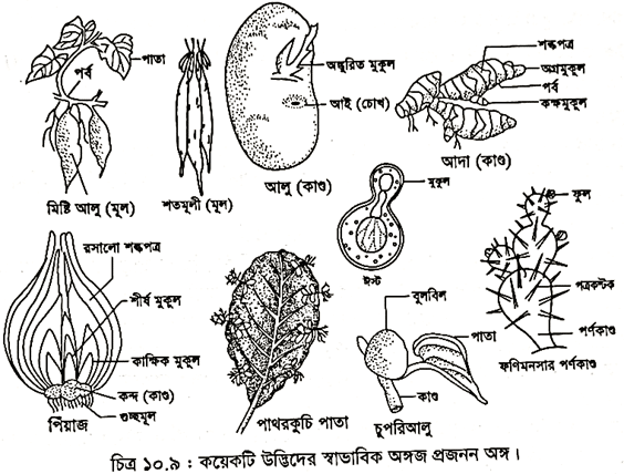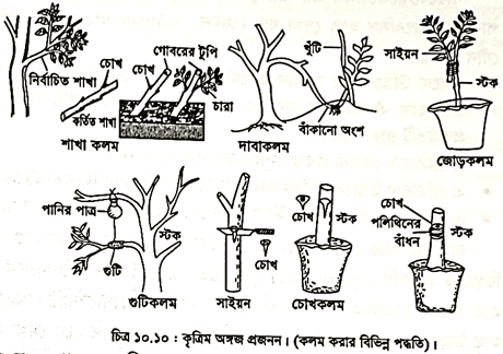 (i) শাখা কলম বা কাটিং (Cutting) : জবা, আখ, গোলাপ, পাতাবাহার, সজিনা, আপেল কমলালেবু ইত্যাদি গাছের পরিণত কাণ্ডের অংশবিশেষ কেটে সিক্ত বা ভিজে মাটিতে পুঁতলে তা থেকে নতুন উদ্ভিদ জন্মায়।